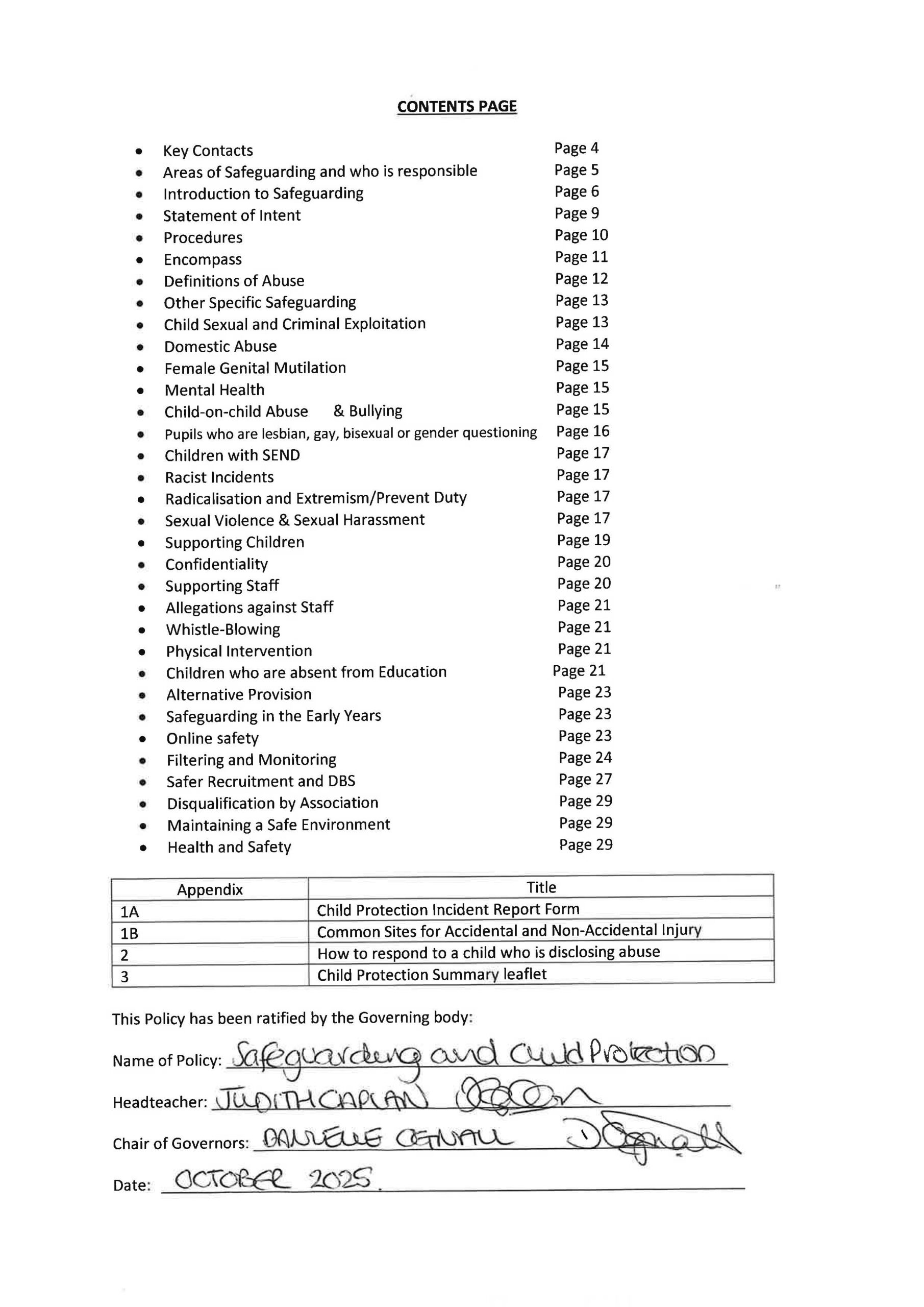 Child Protection and Safeguarding policy signed by the Headteacher and the Chair of Governors