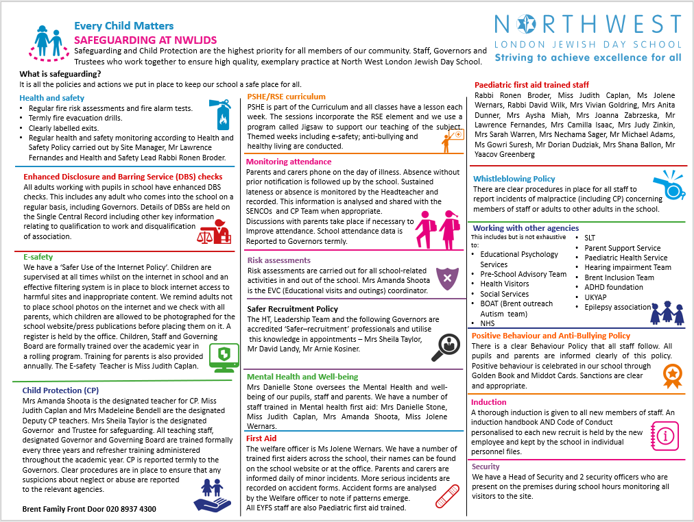 Safeguarding and Child Protection are the highest priority for Staff and Governors who work together to ensure high quality, exemplary practice at North West London Jewish Day School.